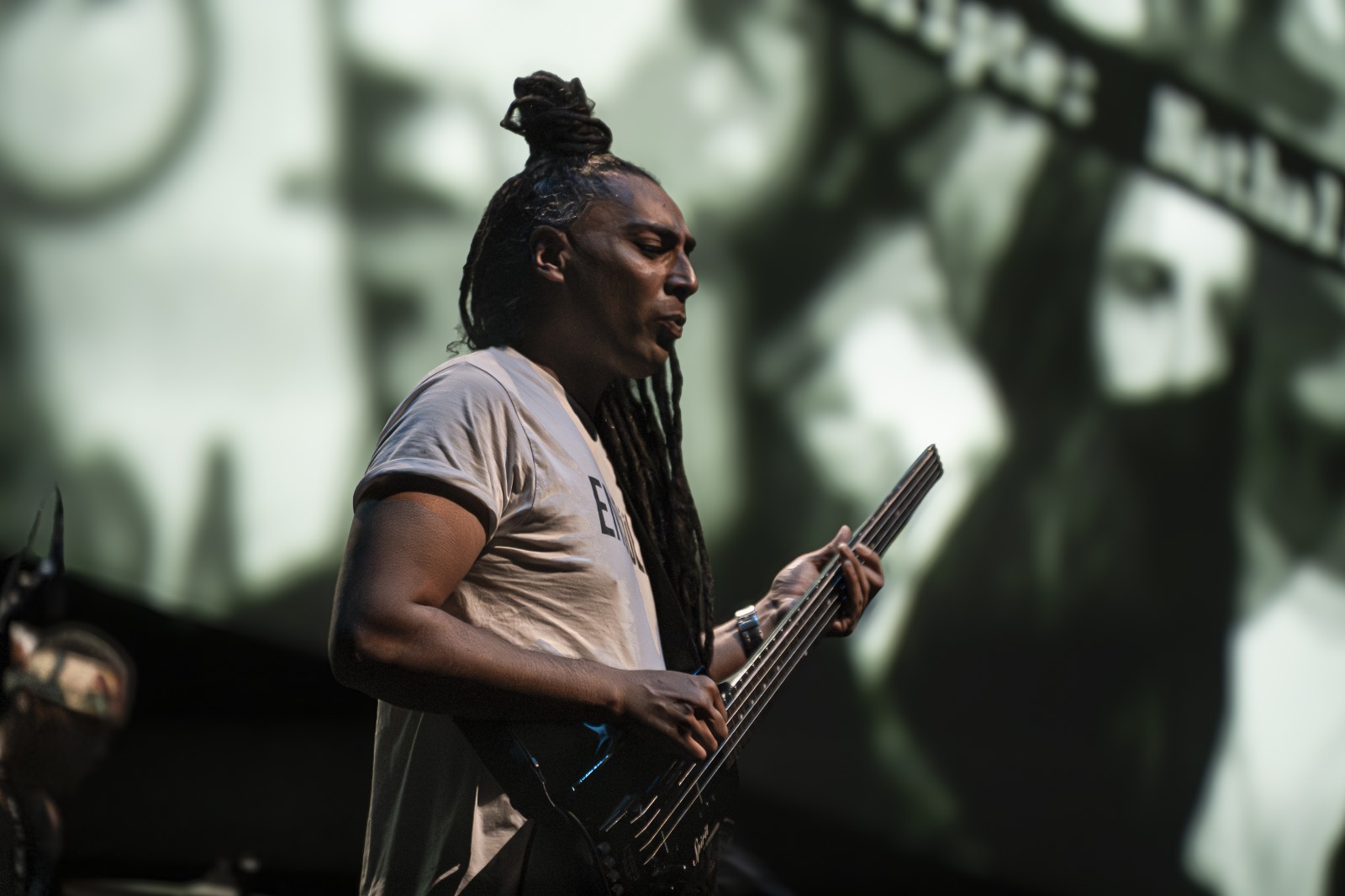 L’impatto sonoro è travolgente, non è quasi possibile restare impalati in poltrona, ci si vuole buttare nella sommossa sullo schermo. I temi musicali restano senza parole e sono riconducibili a vari pezzi soprattutto dell’album citato, fedeli ai temi così caustici. Sperando di non sbagliare, ricordo “Fortress Europe” e “1000 Mirrors” tra i vari. È un ritmo incalzante, con un basso da fondale abissale che non perdona, batteria a volte criminalmente riottosa e a volte marziale, a passo di marcia o di carica sui manifestanti. Le basi sono esoteriche, arricchite da una chitarra fantascientifica che si fa gatto di strada, ferito e fiero che miagola sguaiatamente la sua rabbia e la sua belluina carica repressa.