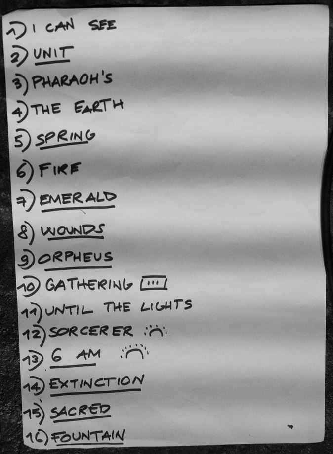 Un tappeto di silicio e rame copre quasi tutta la superficie del palco dove a breve si esibiranno i sei dell’apocalisse sonora. Le rack di effetti dicono già tanto di quanto andremo a sentire, compresi gli ampli a testata valvolare che ben presto urleranno direttamente nella psiche degli spettatori.