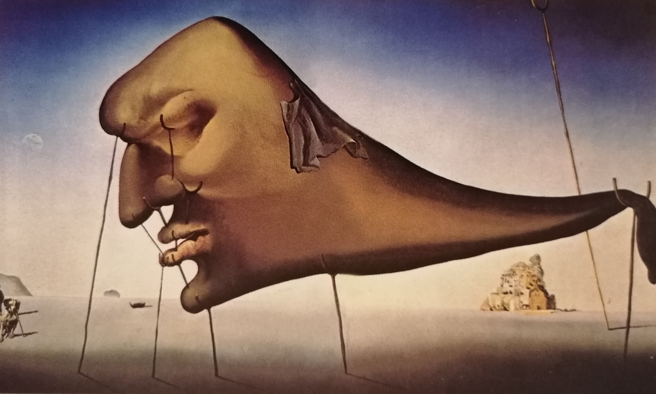 Un desertico paesaggio surreale fa da sfondo alla scena, dipinto in modo da ricordare i contorni poco netti e i colori tenui che rimangono impressi nelle retine al risveglio.
