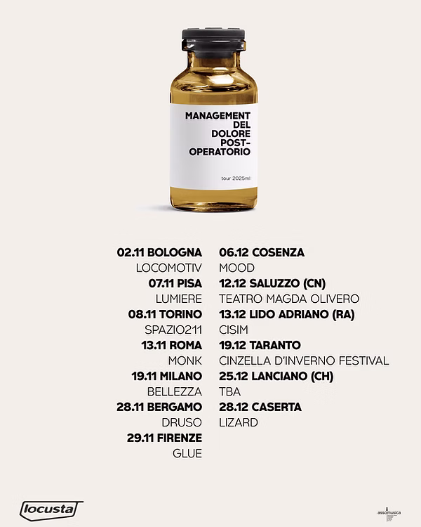 Dopo una lunga pausa il Management del Dolore Post Operatorio torna con un club tour nell'Autunno 2025 con un nuovo spettacolo che ripercorrerà tutta la discografia della band abruzzese. Il Management Del Dolore Post Operatorio non ha una data di scadenza. Il dolore ritorna sempre, prima o poi.