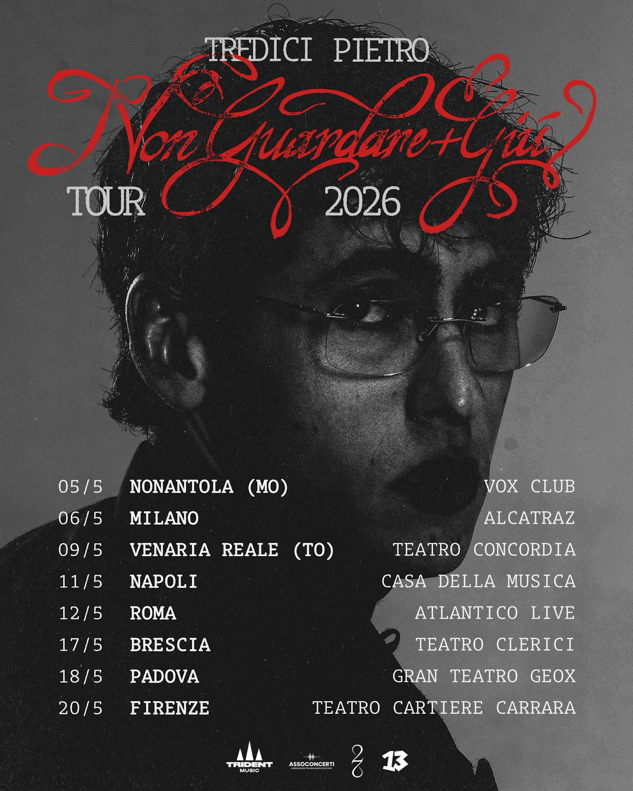 Durante il tour Tredici Pietro riabbraccerà il suo pubblico, portando sul palco i brani più rappresentativi del suo repertorio insieme alle tracce contenute in NON GUARDARE + GIÙ (Sony / Epic), l’edizione speciale del suo ultimo album uscita lo scorso 27 febbraio (qui la nostra recensione). Il disco ha svelato un lato più consapevole e maturo della sua identità musicale, lasciando ampio spazio alla sperimentazione.