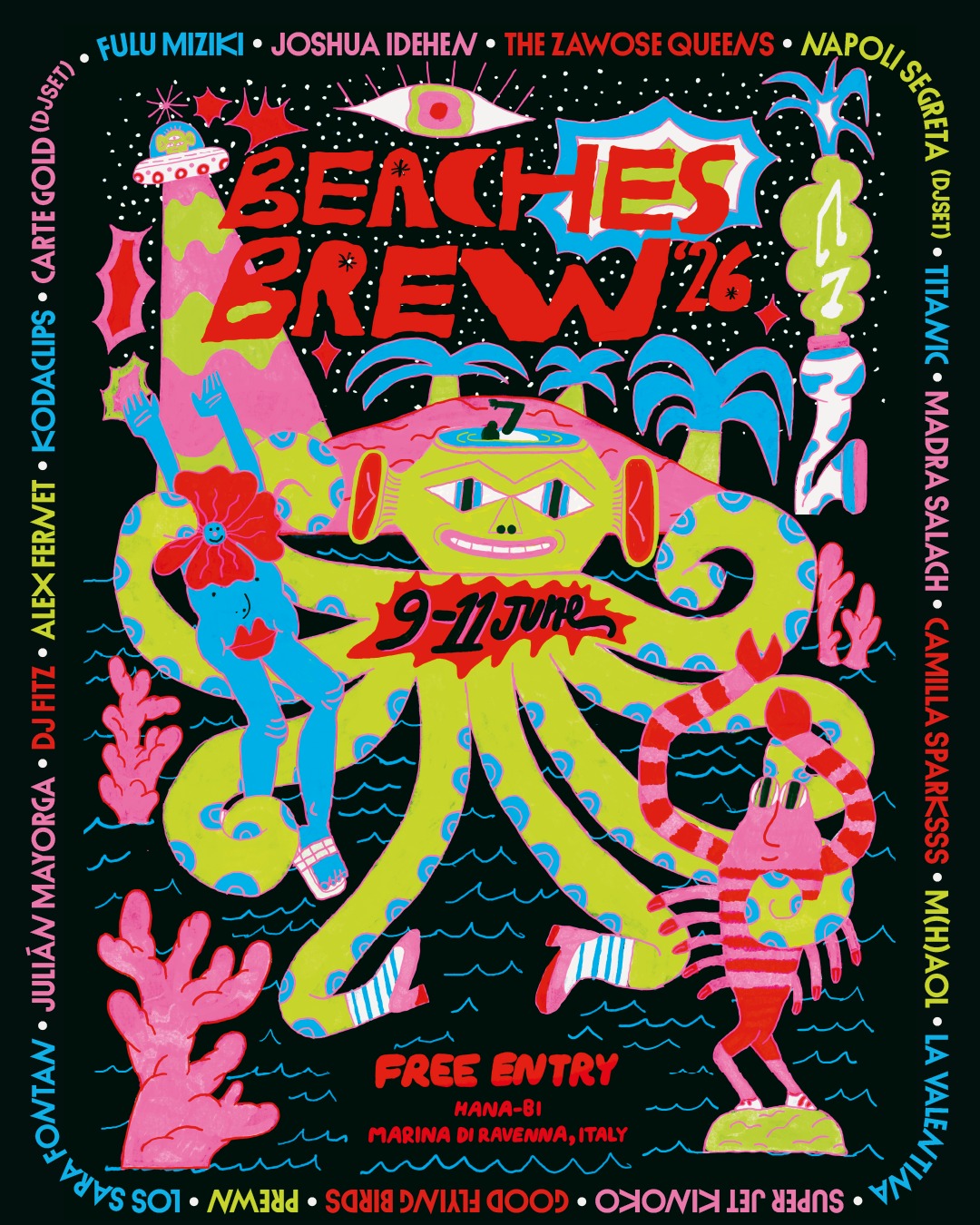 L’artwork originale della dodicesima edizione di Beaches Brew è opera di Sara Arosio, illustratrice e artista visiva che unisce nella sua pratica il disegno tradizionale al digitale per creare universi colorati e naif (saraarosio.com).