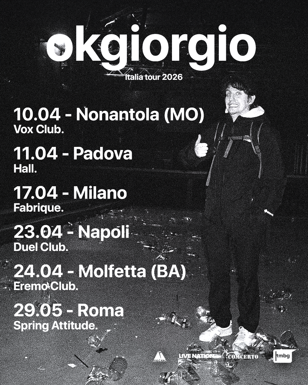 Per la prima volta, l’Italia Tour 2026 porterà dal vivo anche ko mixtape, l'ultimo progetto di okgiorgio: una selezione di brani che unisce elettronica, intensità emotiva e una scrittura immediata, pensata per trovare nei club la sua espressione più naturale.