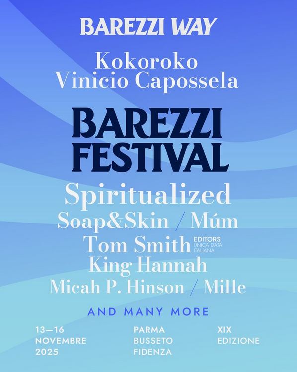 Anche quest’anno la line up di Barezzi si tinge di mille diverse sfumature: dall’intimo progetto solista di Tom Smith degli Editors nella sua unica data italiana alle vibrazioni spaziali di un’icona della scena indipendente come gli Spiritualized, dall’intenso e magnetico indie rock dei King Hannah al velluto sonoro di Soap & Skin, arrivando al pop sperimentale islandese dei múm, al menestrello texano Micah P. Hinson e alla raffinatezza cantautorale di Mille.