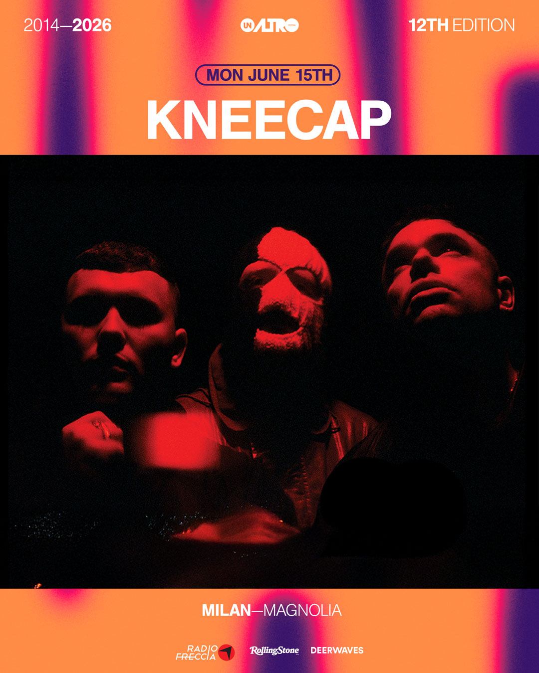 I Kneecap sono un progetto nato a Belfast che ha saputo imporsi a livello internazionale trasformando la loro musica in uno strumento di racconto identitario. Attraverso un linguaggio diretto e senza compromessi, il trio fonde hip hop, punk ed elettronica con testi in inglese e gaelico irlandese, dando vita a una narrazione musicale che intreccia cultura, appartenenza e sguardo sul presente attraverso un'ironia tagliente e testi provocatori.