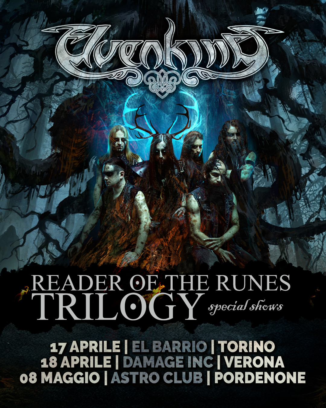 Tre appuntamenti imperdibili per tutti i fan degli Elvenking: i paladini indiscussi del Pagan Metal celebreranno la trilogia di Reader Of The Runes sviluppata nei capitoli Divination, Rapture e Luna con tre concerti esclusivi.