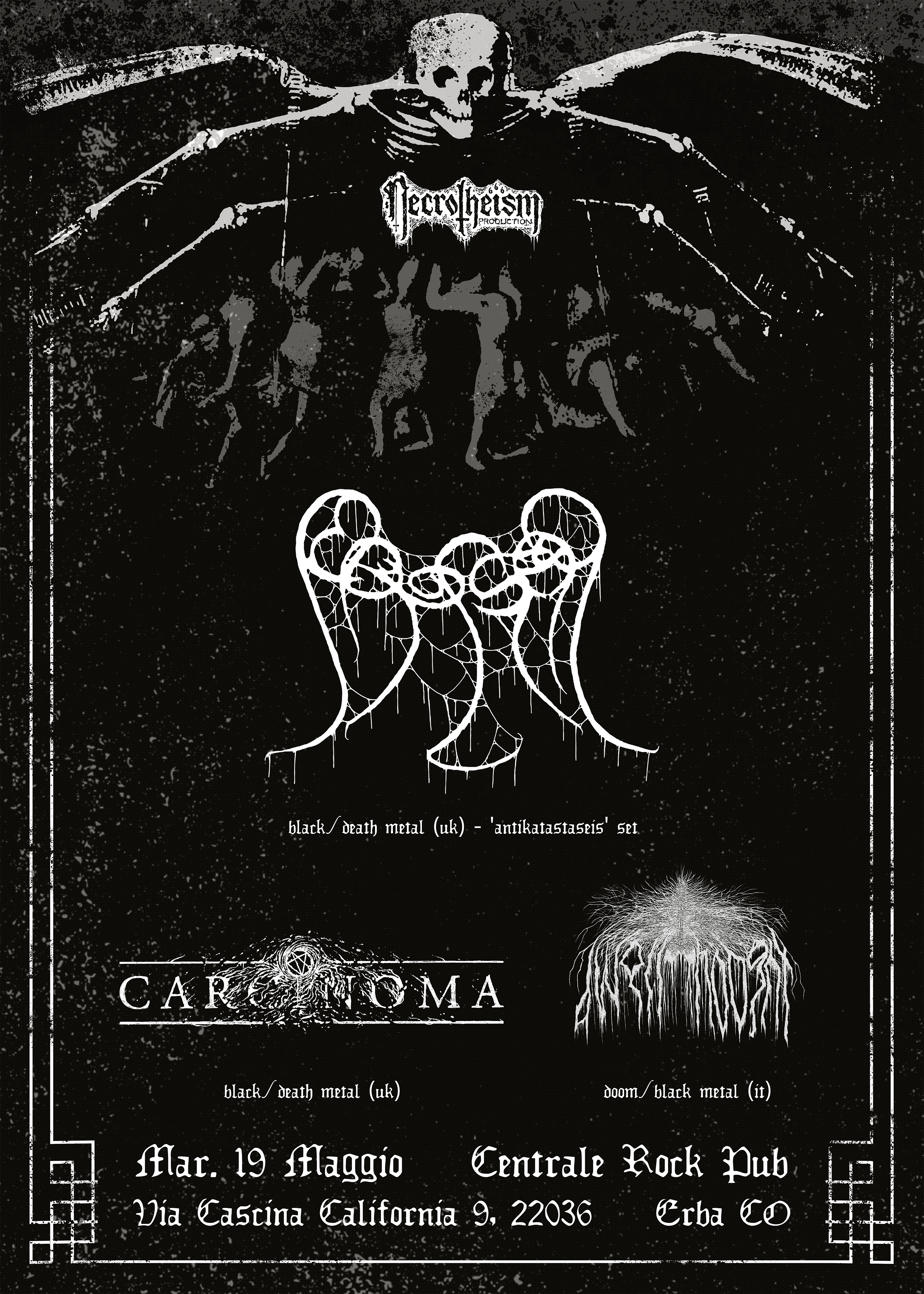 In tour con loro per Killtown Bookings, i Carcinoma (Total Dissonance Worship) rappresentano una delle espressioni più radicali del black/death metal dissonante contemporaneo: un suono che spinge su disorientamento e tensione costante, già messo nero su bianco con il debutto Labascation.
