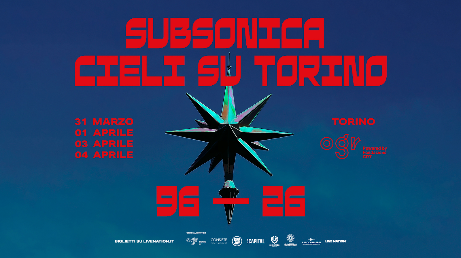 Dopo il ritorno discografico con il nuovo singolo “Radio Mogadiscio”, i Subsonica annunciano CIELI SU TORINO 96-26, quattro speciali appuntamenti live alle OGR Torino (official partner) per celebrare il trentennale di carriera. Le date, prodotte da Live Nation, sono previste per il 31 marzo, 1, 3 e 4 aprile 2026.