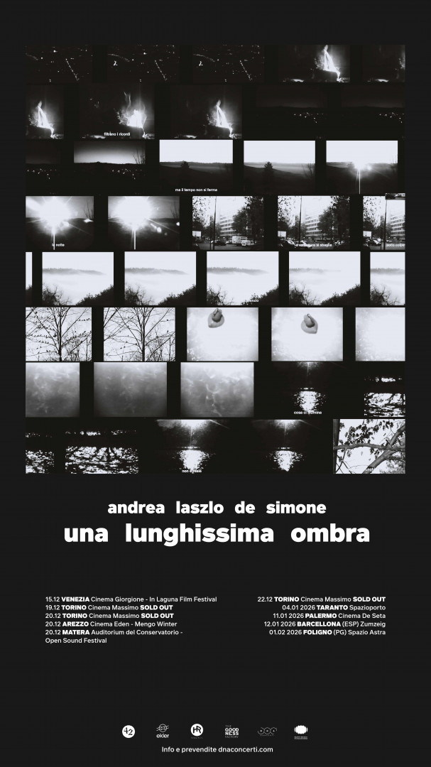 Si parte il 15 dicembre da Venezia al Cinema Giorgione per Laguna Film Festival, per proseguire il 19, 20 e 22 dicembre a Torino al Cinema Massimo (sold out), il 20 dicembre ad Arezzo al Cinema Eden per Mengo Winter e, sempre il 20 dicembre, a Matera presso l’Auditorium del Conservatorio R. Gervasio per Open Sound Festival, e ancora il 4 gennaio 2026 a Taranto a Spazioporto, l’11 gennaio a Palermo al Cinema De Seta, il 12 gennaio a Barcellona allo Zumzeig e l’1 febbraio a Foligno (PG) allo Spazio Astra.