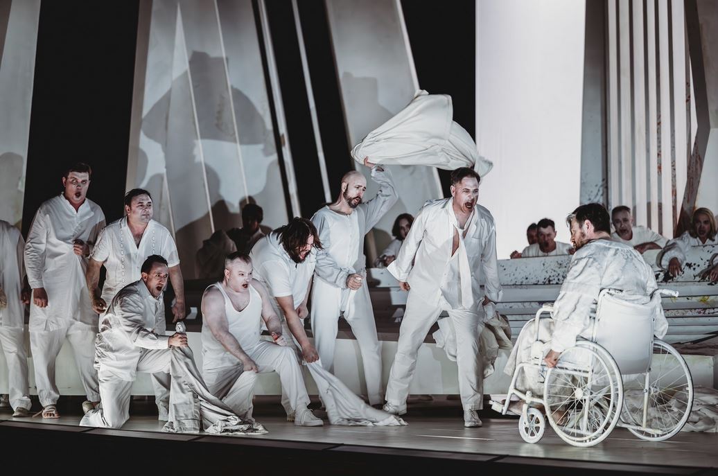 Il tocco di modernità della regia si estende, oltre che all'outfit degli attori, anche alla sedia a rotelle (rigorosamente bianca) su cui Amfortas si presenta seduto, e su cui rimarrà per buona parte dell'opera: simbolo concreto di fragilità, di un personaggio che porta addosso i segni del suo unico cedimento al peccato, e che vive la sua condizione con disperata rassegnazione ed un tocco di vittimismo, tutti ingredienti ben resi dall'ottima prova di un bravissimo Michael Nagy, decisamente a suo agio coi ruoli wagneriani.