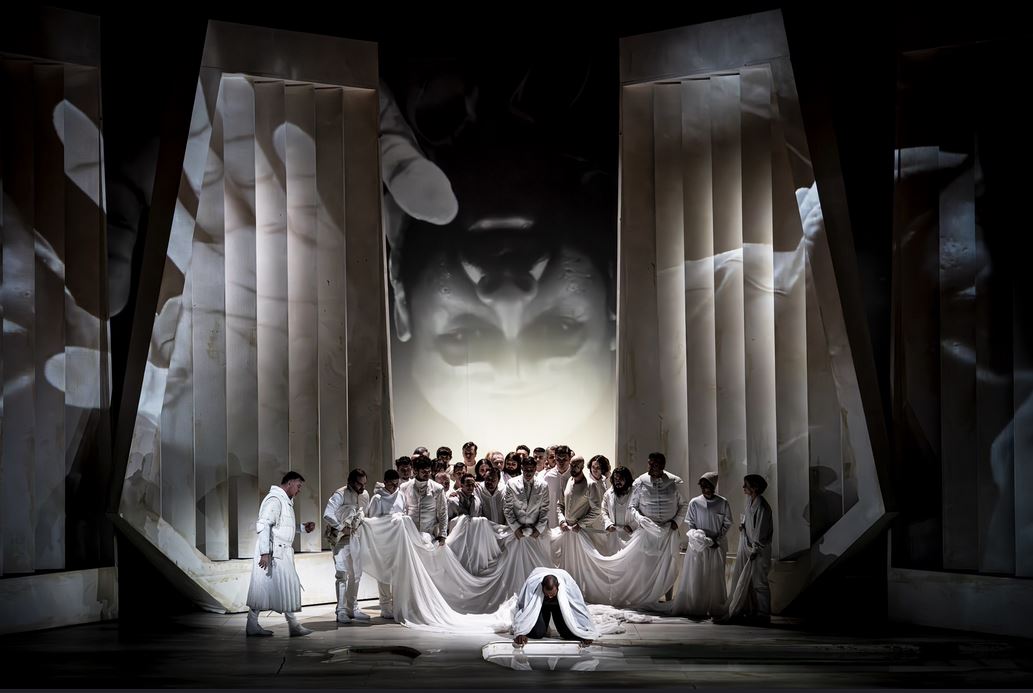 La scena che si apre sul Monsalvat, il luogo dove i cavalieri-monaci custodiscono il Graal, la terra desolata del Re Pescatore Amfortas, vittima di una ferita che nulla sembra in grado di chiudere, è spoglio e dominato dal bianco. Bianche sono le vesti dei custodi, bianco è Gurnemanz, io narrante e coscienza tormentata della vicenda (interpretato splendidamente dal grande René Pape), unico cromatismo differente è rappresentato da Kundry, che entra in scena con pantaloni scuri e maglione rosa (i costumi semplici o addirittura casual disegnati da Regine Standfuss rappresentano una scelta che potrebbe far storcere il naso ai puristi ma che nell'economia generale funzionano bene) a rappresentare la sua alterità rispetto al mondo dei cavalieri, e la sua natura in tormentato dissidio tra la dimensione del bene e quella del male.