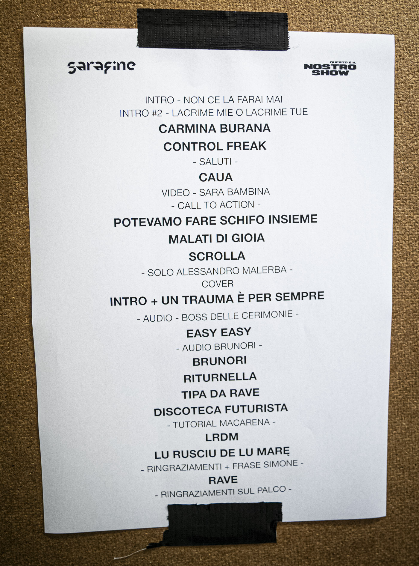Sarafine. Sì, il corpo, la danza e la musica. Diciamo un po' tutto, nel senso che comunque, sai, le mie canzoni sono naturalmente “danzerecce” in alcuni casi, in altre lo sono un po' più... Adesso la nuova canzone che è uscirà a fine mese, e che suoneremo stasera, è un po' più intima, quindi è un pochino più calma dal punto di vista proprio del corpo, del danzereccio, però sì, è un po' una definizione che completa la mia proposta artistica. Sono canzoni che si ballano sicuramente. E poi se c'è chi vuole andare un po' più a fondo, può anche stare lì a riflettere un po' sul racconto.