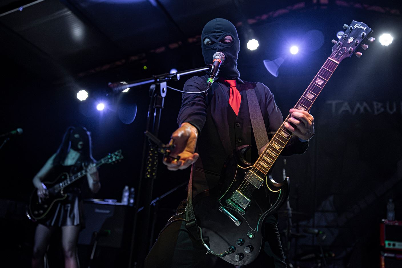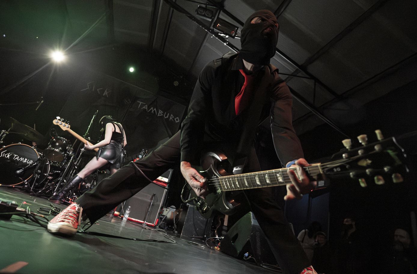 Sotto il palco si raccoglie una comunità eterogenea, riconoscibile nei dettagli. Canotte nere, giubbotti di pelle sulle spalle, anfibi consumati. Tra i capelli creste irrigidite dal gel, segni di un’estetica punk che continua a circolare. Spuntano magliette dei Nirvana e degli AC/DC, simboli che attraversano generazioni e funzionano come coordinate condivise. I più giovani si accalcano verso le prime file con un'energia nervosa, qualcuno indossa un passamontagna nero per emulare l’immaginario della band. Poco più indietro, volti con qualche ruga in più e qualche capello in meno, che hanno attraversato altre stagioni della scena alternativa, osservano con attenzione concentrata. Età e memorie diverse convergono nello stesso luogo. Quando le luci si abbassano e i primi accordi fendono l’aria, la sala si ricompone. Le differenze si assottigliano in un unico movimento collettivo. Resta una massa che canta, spinge, si riconosce nel suono dei Sick Tamburo.