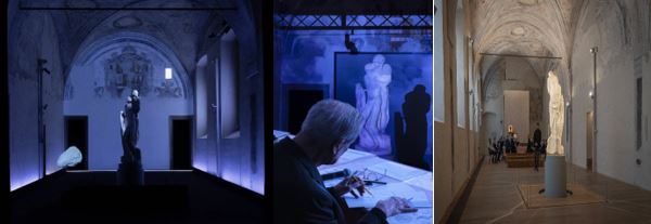 Il tutto, reso ancora più vivido, dall’emersione del blocco marmoreo dal buio assoluto iniziale e che viene di volta in volta rischiarato, quasi sbalzato, da una sequenza di luci ideate dal grande registra/fotografo, che raggiunge il suo climax nell’illuminazione dell’opera con un bianco spettrale con la pietra poggiata sulla destra (vedasi foto) illuminata da uno spotlight rosso sangue.